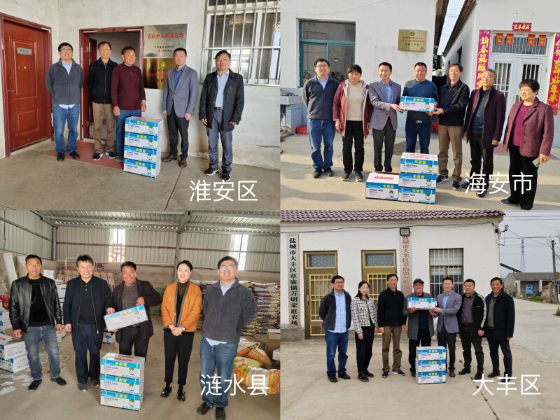 培训结束后,史建荣一行分别赴涟水县鑫耀家庭农场、淮安区智明家庭农场、大丰区万明家庭农场、海安市墩头镇五一家庭农场等示范基地开展小麦生产情况调研,就农户关心的小麦赤霉病及其镰刀菌毒素污染防控问题进行了现场指导,并分别给每个示范基地发放了可用于2000亩小麦赤霉病及其镰刀菌毒素污染防控的药剂乐麦宝等农资。