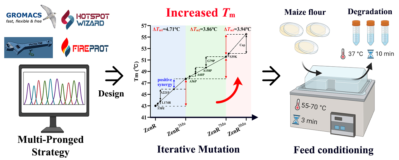 近日,针对上述问题,江苏农业科学院农产品质量安全与营养研究所粮油安全与营养创新团队在一区Top期刊《Bioresource Technology》(IF:9.0)发表了题为“Multi-pronged design enhances thermostability of zearalenone hydrolase ZenR for enzymatic detoxification of maize flour”的研究论文。研究团队以高比活水解酶ZenR为研究对象,综合利用多策略理性设计与迭代优化,对酶分子柔性区域与关键结构进行系统优化,成功构建了高热稳定突变体ZenR9Mu。该突变体熔解温度(Tm)较野生型提高了12.5 ℃,在56 ℃条件下仍可保持约60%的酶活力。进一步在玉米粉中模拟饲料调质处理加工条件,证实ZenR9Mu可在10 min内将玉米粉中ZEN含量由1.12 μg/g降至0.31 μg/g,满足我国饲料安全限量要求。