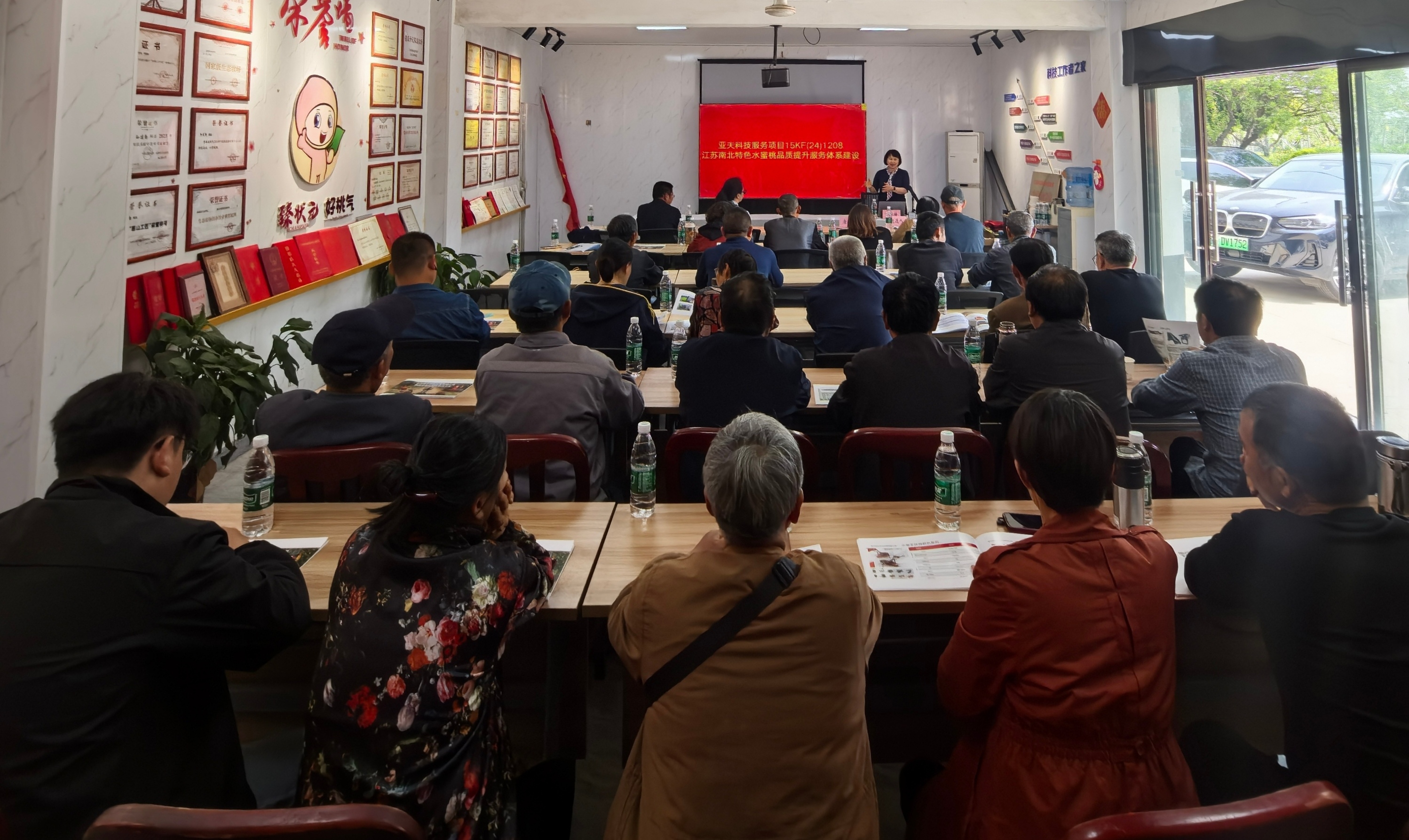 为推进亚夫科技服务项目“江苏南北特色水蜜桃品质提升服务体系建设”深入实施,进一步扩大技术推广覆盖面,提升基层桃农的质量安全意识和标准化生产水平,4月10日,项目专家团队赴无锡市惠山区建勤家庭农场,组织开展优质桃全程质量安全与品质提升技术培训。来自周边乡镇的桃农代表、家庭农场主及基层农技人员共50余人参加了此次培训。